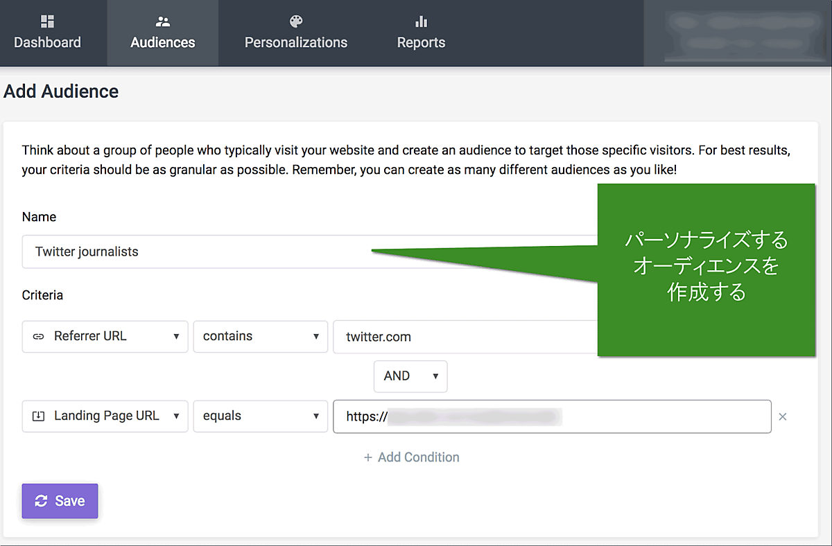 まず、Alter内にオーディエンスを作成する。条件指定は働きかけの戦術に合わせて好きなだけ組み合わせられる。