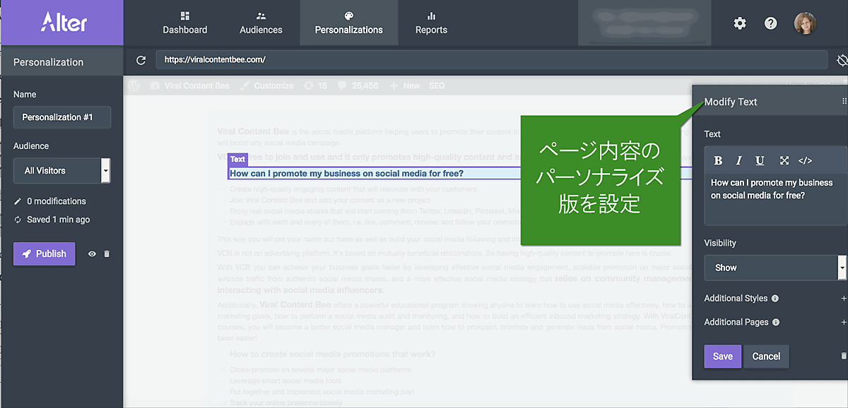 Alterに組み込まれたエディターを使い、その条件に該当したオーディエンスが訪問した際にページをどうパーソナライズするかを設定できる。