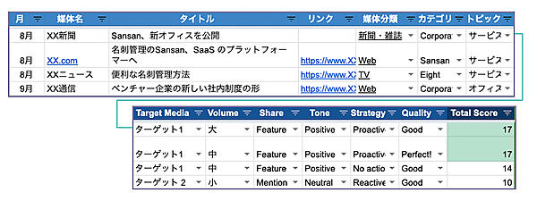 アクションを起こさずとも、棚ぼたで著名なTV番組に出たり、有名な新聞に掲載されたりすることもあり、単に掲載記事のみをカウントしても本当の広報効果は見えづらい。自分たちから働きかけて記事になったものと、問い合わせから記事になったもの、ターゲットとしている媒体の記事と、特に製品やサービスに関係ない媒体の記事、内容のネガポジ分析などをそれぞれ数値化(スコアリング)することで、広報効果を測定する指標になる。