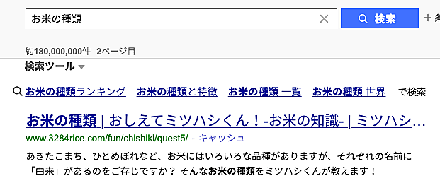 たとえば、「お米の種類」というクエリで検索すると、Google検索では、3284rice.com から引用した強調スニペットが出ている。