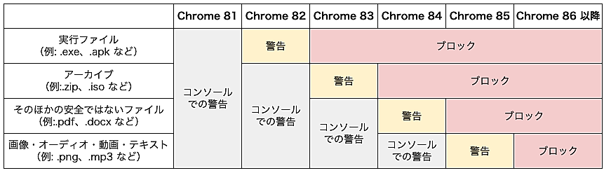 ファイルの種類に応じても制限の度合いが異なる。Chrome 86(2020年10月リリース予定)以降のバージョンでは、ファイルの種類を問わずダウンロードがブロックされる。