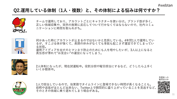 次に、話題は運用体制(1人・複数)と、運用する上での悩みの話へ移った。各社の運用体制は、以下の通りだ。
