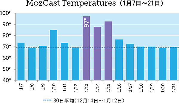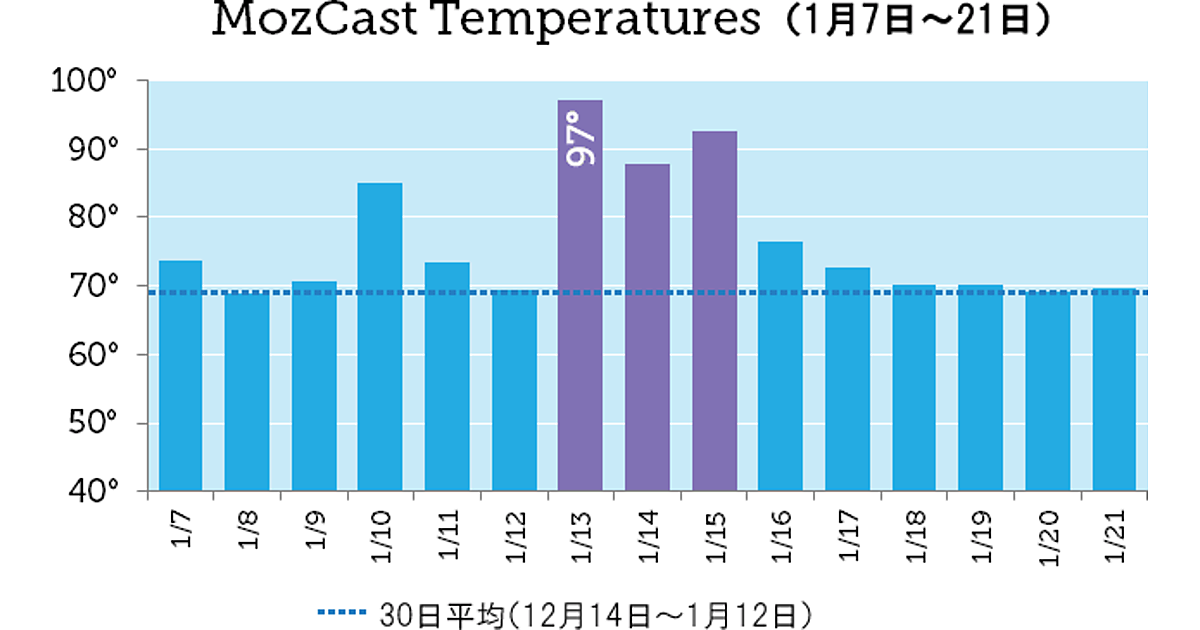 グーグル検索アルゴリズムの大きな変動が1月13日から3日ほど続いていたことを、MozCastが示した(点線は1月13日より前の30日間の平均を示しており、これは過去の平均と一致している)。
