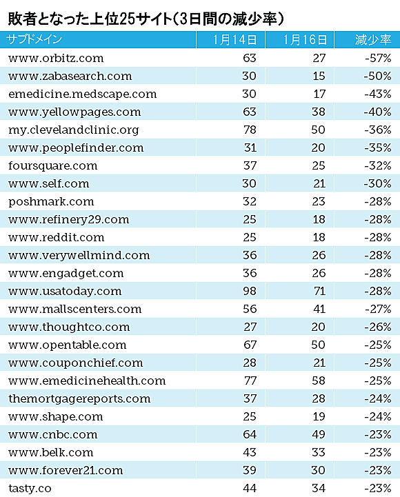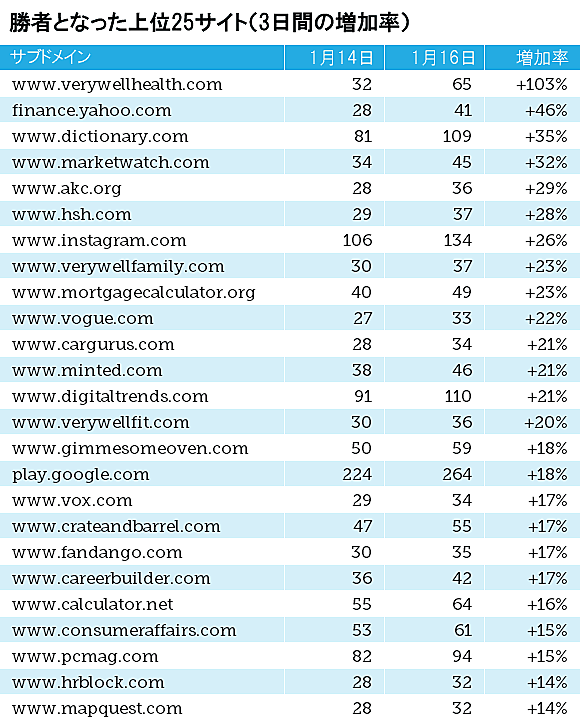 まず、アップデートの3日間で勝者となった上位25サイトの変動率を示した。「1月14日」と「1月16日」の列は、これらの日に検索上位に表示された総数(SERPシェア)を表す。