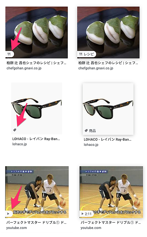 PC画像検索で、レシピ/商品/動画にバッジアイコン表示へ