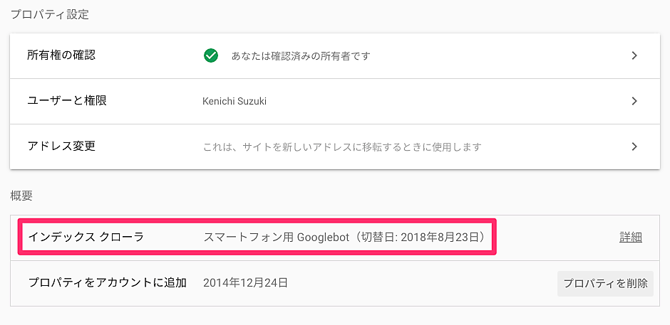 概要セクションで「インデックス クローラ」が「スマートフォン用 Googlebot」になっていればMFIへの移行が完了している。いつMFIに切り替わったのかもここでわかる。