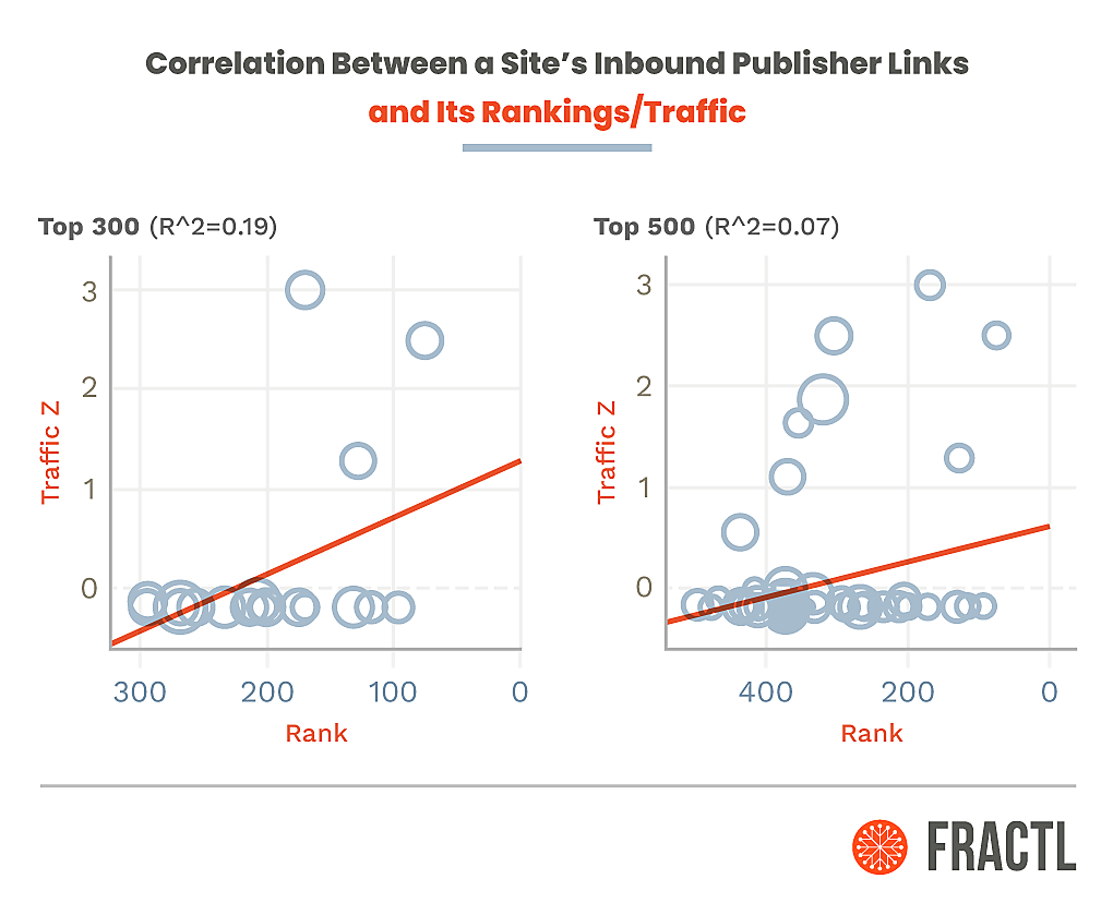 次に示すグラフは、パブリッシャーによる記事の本文からサイトにリンクされた回数と、そのサイトの検索順位と検索トラフィックとの相関関係を表している。
