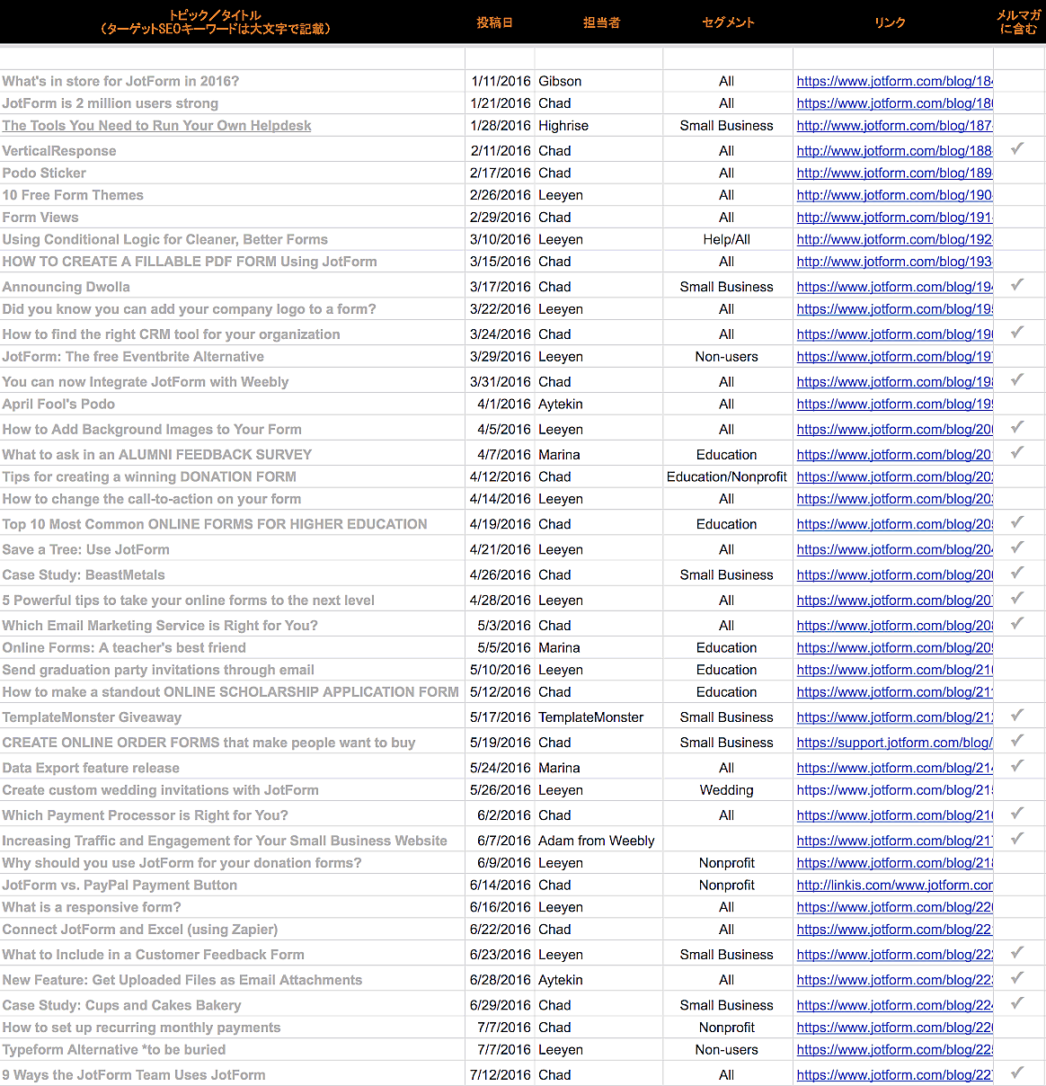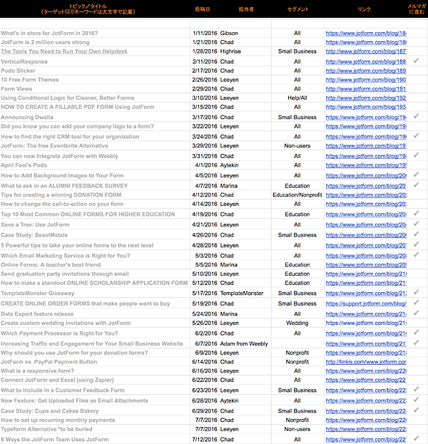以前から僕たちは、Googleスプレッドシートを使って編集カレンダーをつくっていた。ブログ記事を1週間に1本か2本ほど公開していた頃、記事を整理する方法が必要だったために使い始めたものだ。これは使えるツールだった。