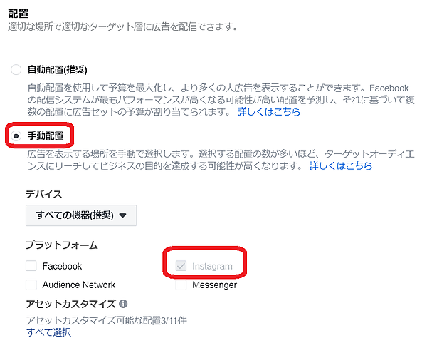 「配置」では、広告の掲載場所を設定できます。Instagramにのみ広告を掲載する場合、「手動配置」を選んだ上で、「プラットフォーム」の「Instagram」だけチェックマークを付けてオンにします。「フィード」や「ストーリーズ」についても同様に、Instagram関連だけをオンにしてください。