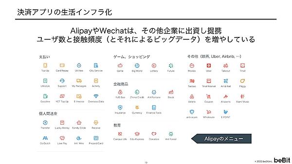 中国では2種類のQRコード決済が広く利用されている。アリババの「Alipay(アリペイ」とテンセントの「WeChatPay(ウィチャットペイ)」だ。多くの人が、その2種類をうまく使い分けているという。宮坂氏は、「決済アプリの本質は、支払いの便利さではなく、あらゆる生活サービスのゲートウェイになっていることだ」という。以下はAlipayのメニューで、WeChatPayでもほぼ同様だ。
