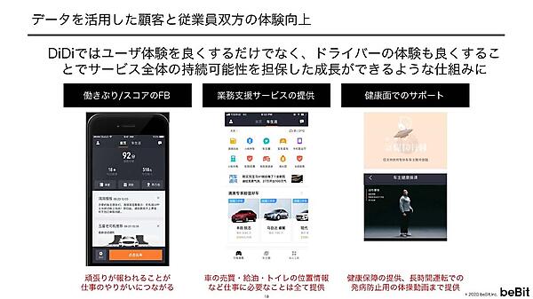 タクシー配車サービスの「DiDi」は、データを活用して顧客と従業員双方の体験を向上させている。とくに、ドライバーに向けたアプリは面白い取り組みをしていると宮坂氏は紹介した。その取り組みとは、以下のようなものだ。