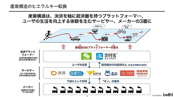 ここまでで紹介された中国の生活サービスを見ると、中国では産業構造のヒエラルキーが変化していることが想像できる。現在の中国で最も強い立場にあるのは決済プラットフォームを持っているアリババとテンセントだ。その下で繁栄しているのがモバイク、フーマー、DiDiなどのような「サービサー」の企業だ。そして、メーカーは非常に立場が弱くなっている。