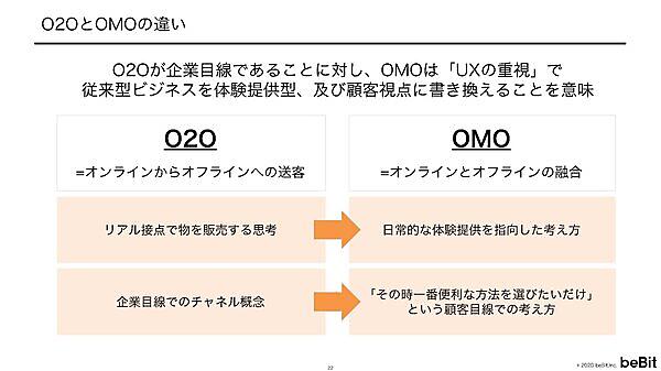 OMO(Online Merges with Offline)は、O2O(Online to Offline)が進化した概念だ。たとえばO2Oでは、「Webでクーポンを配って実店舗への来店を促す」といったことが典型的だが、OMOではオンラインとオフラインを一体のものと捉える。冒頭で紹介したAmazonのホールフーズが、まさにOMOだ。