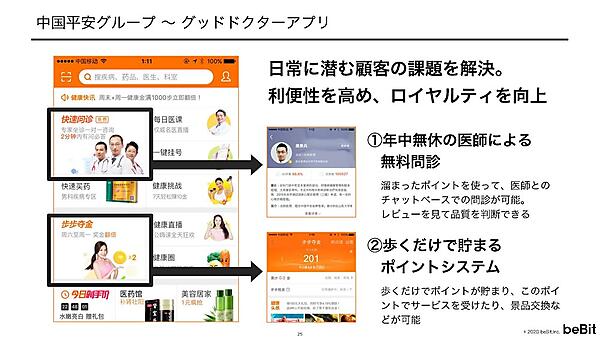 宮坂氏は、中国のOMOの例として、「中国平安保険(以下、ピンアン)」という保険会社を紹介した。ピンアンは保険会社だが、10年ほど前から「商品」で差別化することは難しいという自己認識のもと、OMOへ舵を取った。そして、金融を軸にして生活に関するサービスを充実させたが、その中でも人気なのが「グッドドクターアプリ」だ。中国では、大学病院などの大病院に患者が集中して、病院にかかるのが大変という課題があり、このアプリではそれを解決する以下のようなサービスを提供している。
