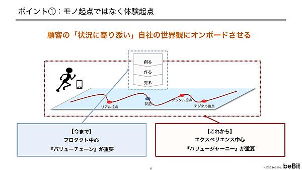 今までは物中心のマーケティングだったが、これからは顧客の状況に寄り添い、自社の世界観にオンボードさせていく必要がある。良い体験を提供し、顧客との関係構築を中心にするマーケティングに変えていけるかが重要。