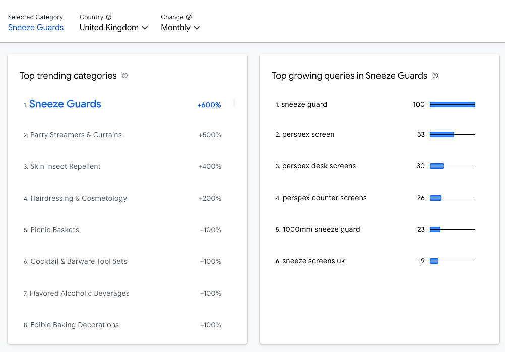 たとえば、直近1か月で英国では「Sneeze Guards(スニーズ ガード、飛沫防止スクリーン)」の検索ボリュームが600%増というデータが出ている。スニーズ ガードは透明の仕切り板だ。新型コロナウイルスの感染対策のために需要が伸びていると推測される。