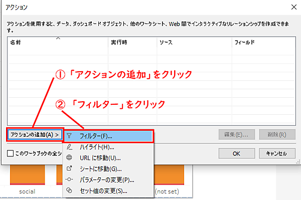 木田: 「流入Top10」のグラフをクリックすると、「ランディングページ」のクロス集計表が変わるというフィルターを設定していきますので、①「ソースシート」は「流入Top10」にチェックし、「ターゲットシート」は「ランディングページ」にチェックをします。②アクションの実行対象は「選択」にして、③「OK」で閉じます。