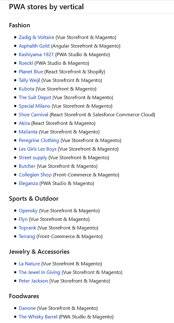 アパレルから宝石、生活、健康、美容などさまざまなジャンルのPWA製ECサイトが集まっている。情報も英語で紹介されているのも英語サイトだが、