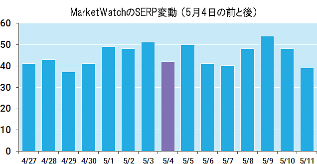 ここでの問題は、MarketWatchの通常のSERP変動がどのようなものなのか、これらの数字からはわからないということだ。次のグラフは、5月4日(コアアップデートの開始日)の前後7日間を示したものだ。