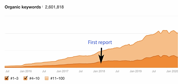 そこで、2018年も数か月が経ったころ、先に進めない問題に対処するためにチームは方針を転換し、SEO主導のまったく新しいコンテンツ戦略を策定した。結果、この2年の間にオーガニック検索で上位を獲得するブログ記事が次のように増加した。