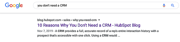 この記事は現在、「CRMは必要ない(you don't need a CRM)」という検索クエリでSERPの1ページ目に表示される。しかし実際のところこの記事の内容は、CRMが必要な理由を冗談まじりの皮肉で説明しているものなのだ。