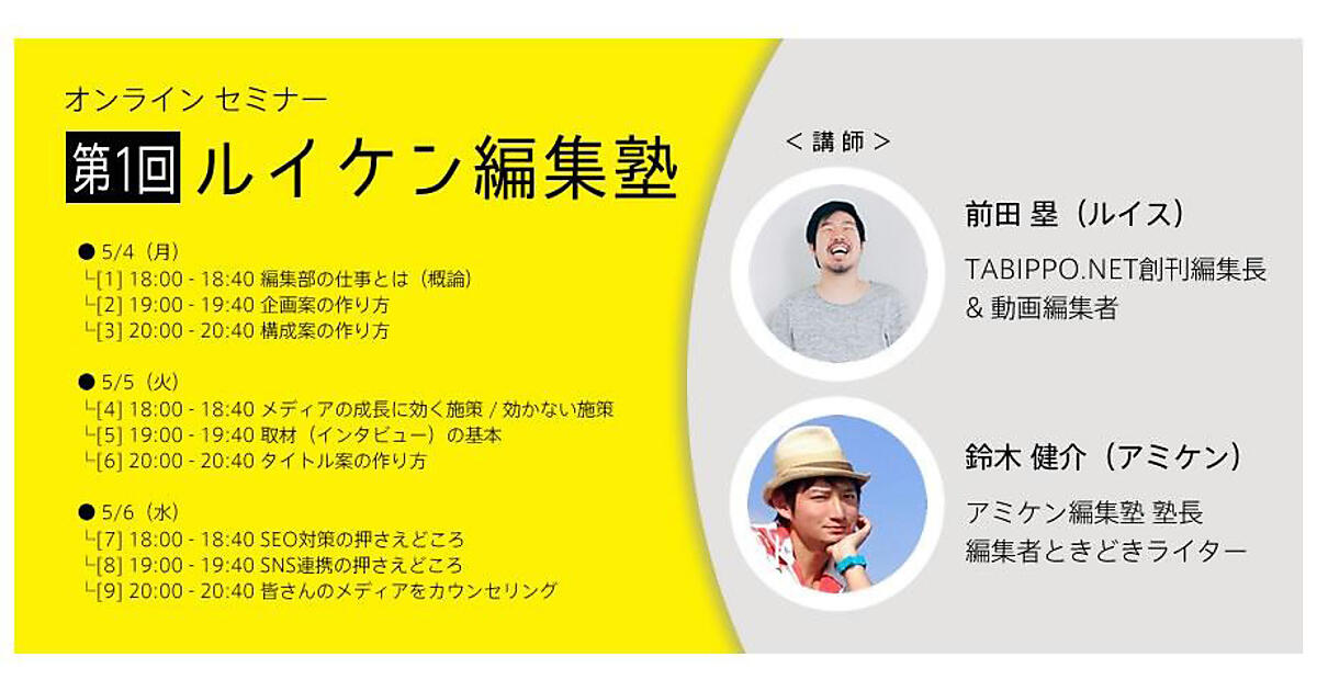 ルイケン編集塾は、2020年5月4日~6日にオンラインで行われた、Webメディアやオウンドメディア担当者向けの基礎スキルが学べる全9コマのセミナーだ。講師はTABIPPO.NETの編集長を務める前田塁さん(以下、ルイスさん)と、編集者歴15年・現在はフリーランスとして活動中の鈴木健介さん(以下、アミケンさん)だ。