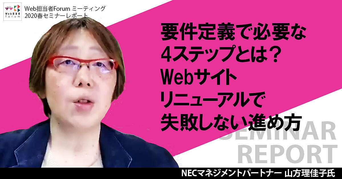 オンラインで行われた「Web担当者Forum ミーティング 2020 春」のセッションで、NECマネジメントパートナーの山方理佳子氏は、Webサイトリニューアルのために気を付けるポイントは、ズバリ「要件定義」だと説く。はたして、その心とは?