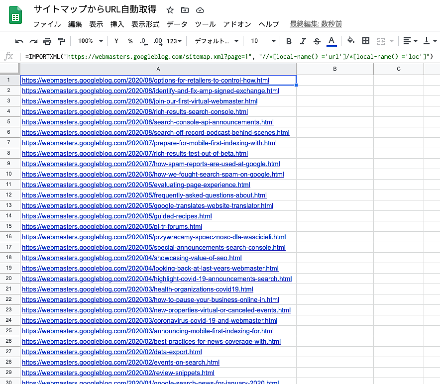 =IMPORTXML("https://example.com/sitemap.xml", "//*[local-name() ='url']/*[local-name() ='loc']")https://example.com/sitemap.xml の部分は、URLの一覧を取得するサイトマップのURLに置き換える(前後の""を削除してしまわないように注意)サイトマップに記述されているURLをいっきに取得してくれる。