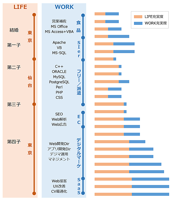 フリー、派遣時代はデータベース系はOracle(オラクル)、MySQL(マイエスキューエル)、PostgreSQL(ポストグレスキューエル)、言語はC++(シープラスプラス)、Perl(パール)、PHP(ピーエイチピー)を身に付けました。短時間勤務、残業できない、急に休むなどの悪条件なので、きた仕事は選り好みせずにできるように、何でも勉強しました。特定の分野の上級者を目指すよりも、どんな仕事もまんべんなくできる「偏差値55」を目指して幅広くスキルを身に付けることを意識していました。正社員時代よりも時間があったこともありますが、なにより危機感があり、いろいろなことを勉強しました。