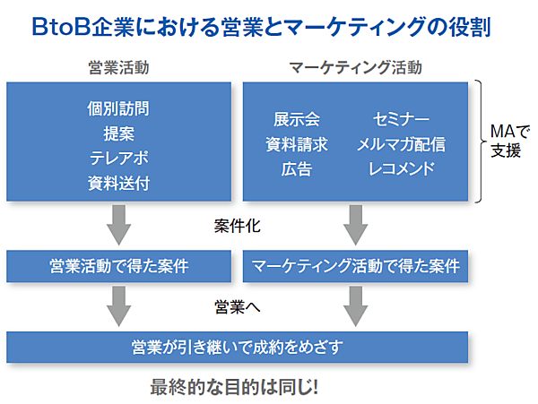 さらに、上述の①~④の仕組みがすでにあったとしても、MAがうまく活用されない理由に、企業の組織体制も大きく影響している。MAを導入して活用していくのは、もちろんマーケティング部門だが、見込み客を絞り込んだら営業部門に引き渡すことになる。つまりマーケティングオートメーションは営業部門との連携なくして、MA活用の成功は難しいだろう。