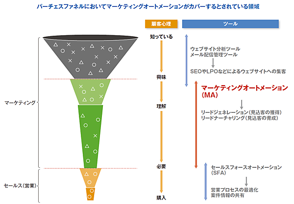 企業におけるマーケティング活動の目的の1つは、見込み客に対して商品の認知を高め、訴求をすることで、商談につなげて、最終的に購買や利用につなげることだが、MAはその活動を支援する。