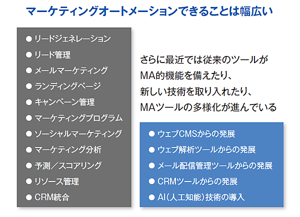 MAには、膨大なデータの分析や集計を自動化して、販促や顧客育成を最適化するといった数多くの機能があるが、それらを目的や用途ごとに個別に切り出して単機能ツールとして、提供されているものもある。