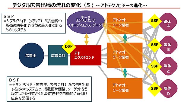 デジタル広告はテクノロジーが発展するにつれ、介在するプレーヤーが増えてきたという。デジタル広告は媒体数が非常に多いため、媒体ごとに広告掲載の交渉をするのは時間がかかる。そのため、「アドネットワーク」というネット広告のサイトを多数集めた広告配信ネットワークの仕組みができた。アドネットワーク業者が複数登場すると、それらを束ねる「アドエクスチェンジ」という仕組みが生まれた。