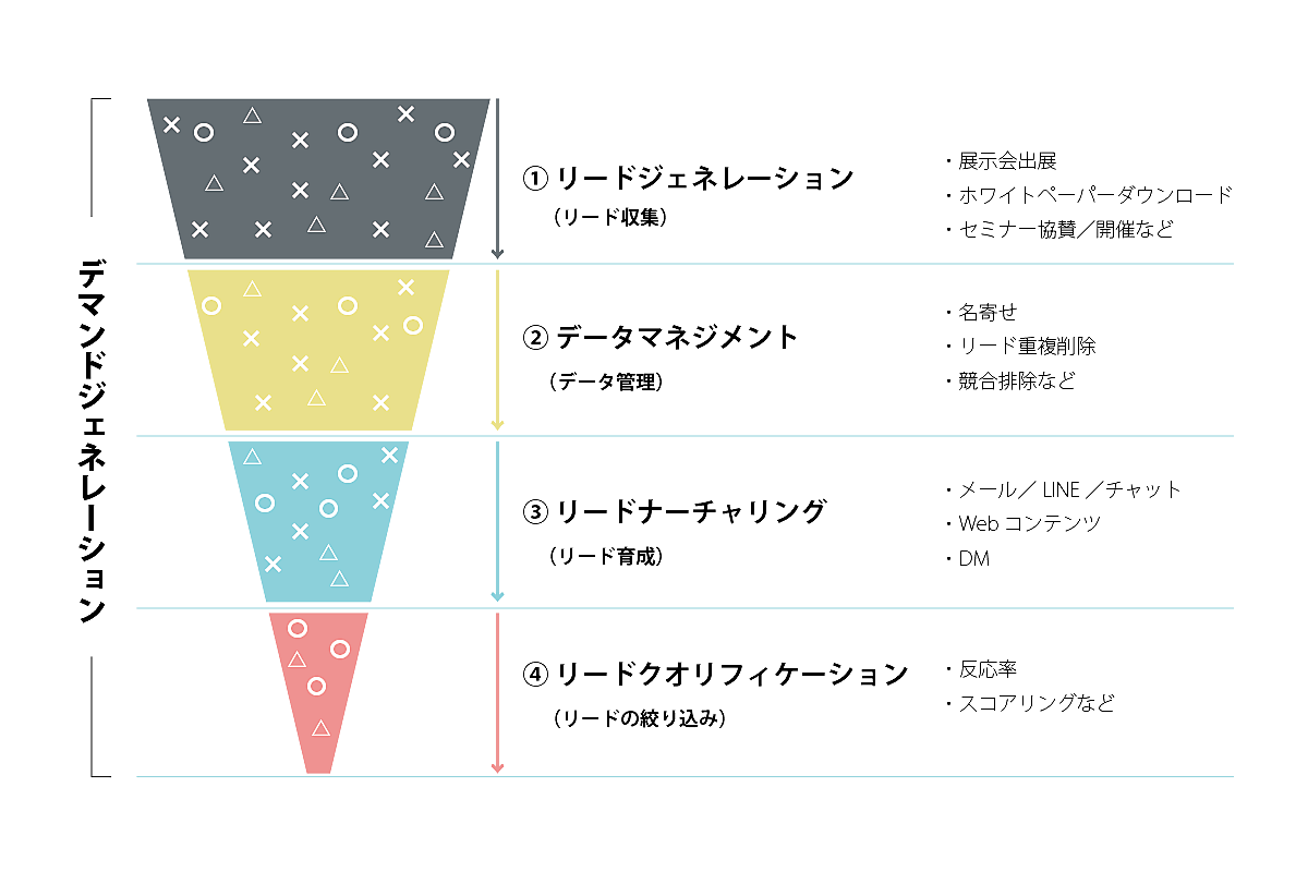 データマネジメント(データ管理):獲得したリードの名寄せ、企業名・部門・個人名の紐付、属性情報の付与、競合排除などのデータ整理。整理できていないと、メール配信のミスなどの事故を引き起こす。