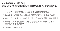 具体的な制限としては、サードパーティCookieがブロックされるのはもとより、ファーストパーティCookieについても厳しく制限されることになった。1つはJavaScriptで生成されたCookieの有効期限が7日間となること。なお、サーバで生成されたCookieの有効期限はその制限を受けない。2つめは、Safariによってトラッカー(ユーザー行動の追跡者)認定されたドメインから、クリックIDなどのパラメータ付きリンクで流入した場合、Cookieの有効期限が1日となること。