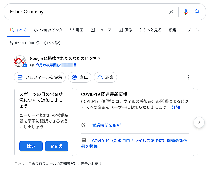 自分が管理するビジネスの名称で検索するとキャプチャのようなエリアがトップに出てくる、ここから操作可能だ。