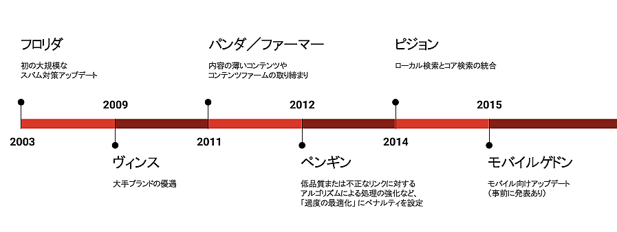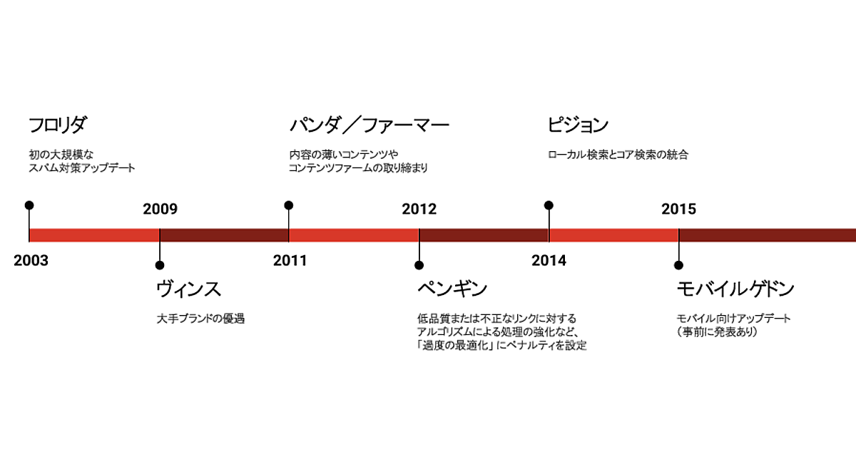 最近この業界に入った人は、いくつかのグーグルアップデート(最近の「コアアップデート」など)を実際に体験しただろうし、むかし実施されたアップデートについてもいくつかは聞いたことがあるだろう。しかし、(グーグルが初めて大規模なアップデートとして認めた)「フロリダ」に続き、ブランドに関するシュミット氏のコメントのすぐ後に提供が開始された「ヴィンス」は、大手ブランドに有利となる特筆すべきアップデートだった。歴史全体を把握していない人は、ここでこれまでの主なアップデートを確認できる。