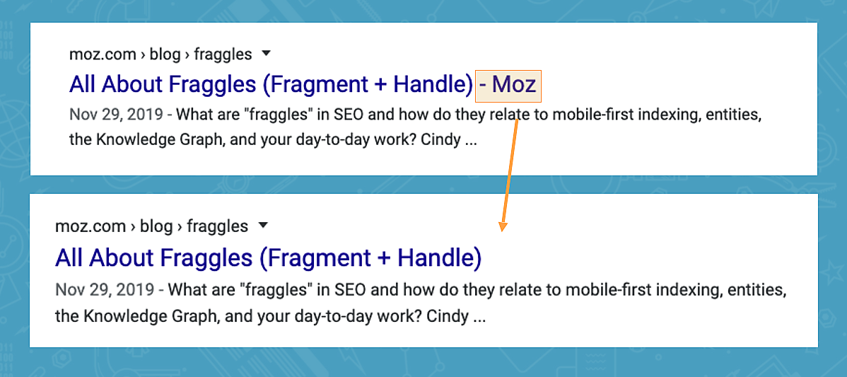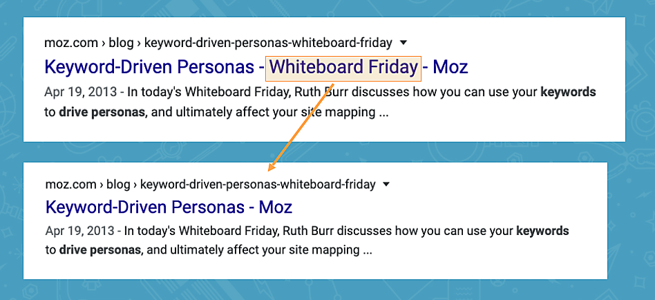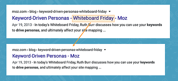 実験では、title要素から「Whiteboard Friday」を削除するとトラフィックが増加したのに、「Moz」を削除しても同じ結果にはならなかった。この理由は、次に示す簡単なテクニックによってわかる。