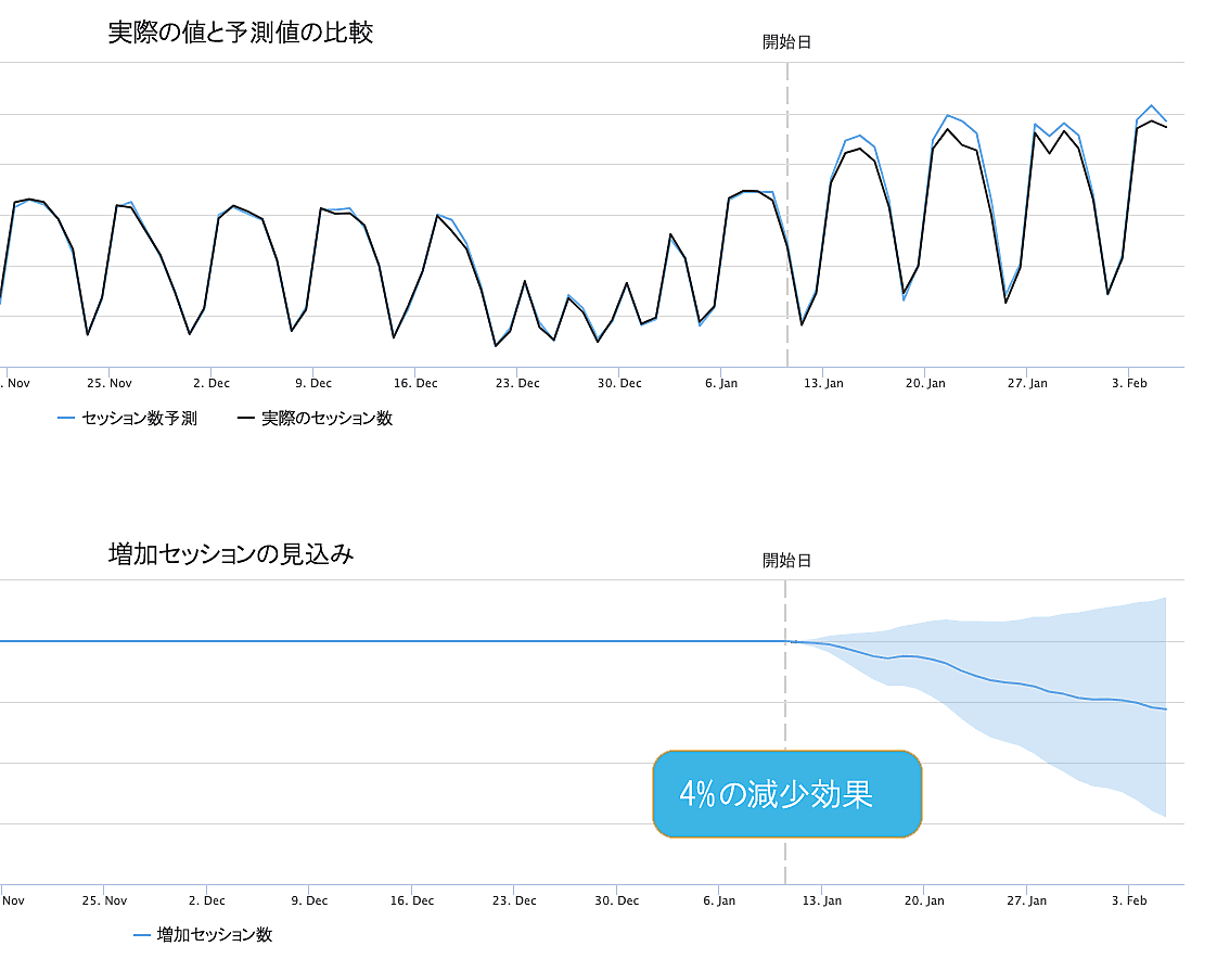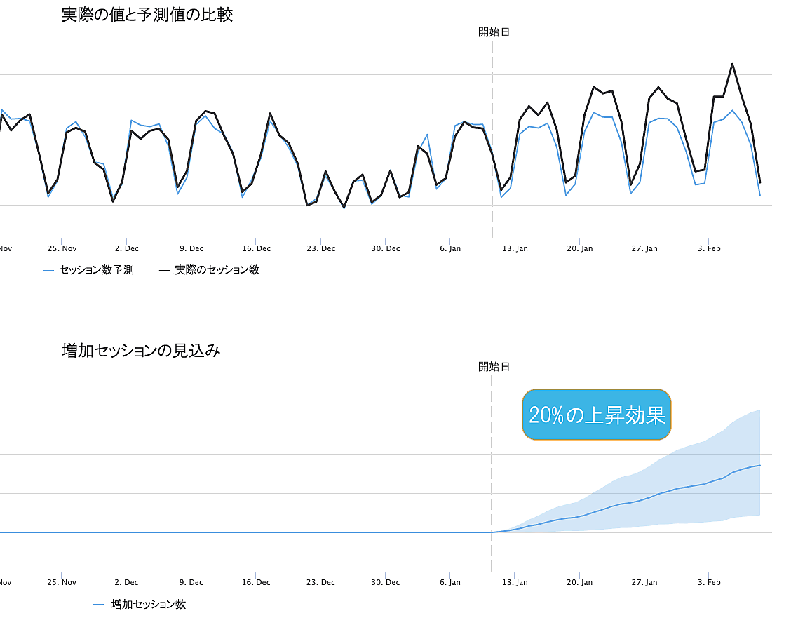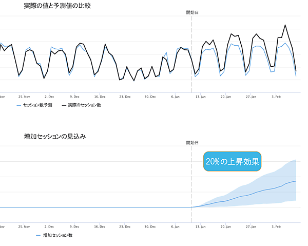 中央の青い線は、変更を加えた方のページが、何の変更も加えていない場合に予想される結果と比べてどのような効果を上げるかを最も正確に予測している。