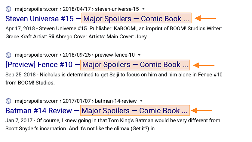 ボイラープレート部分がかなり長くなることもある。コミック本のレビューサイトMajor Spoilers(「大いなるネタバレ」とは、素晴らしい命名だ!)では、多くのページで同じ65文字のボイラープレートが含まれている。