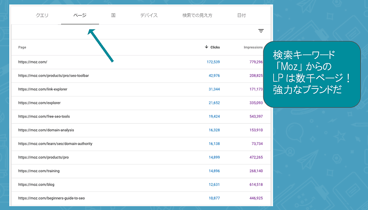 たとえばブランド名「moz」が含まれるキーワードで絞り込むと、検索結果に表示される多くのURLが表示される。