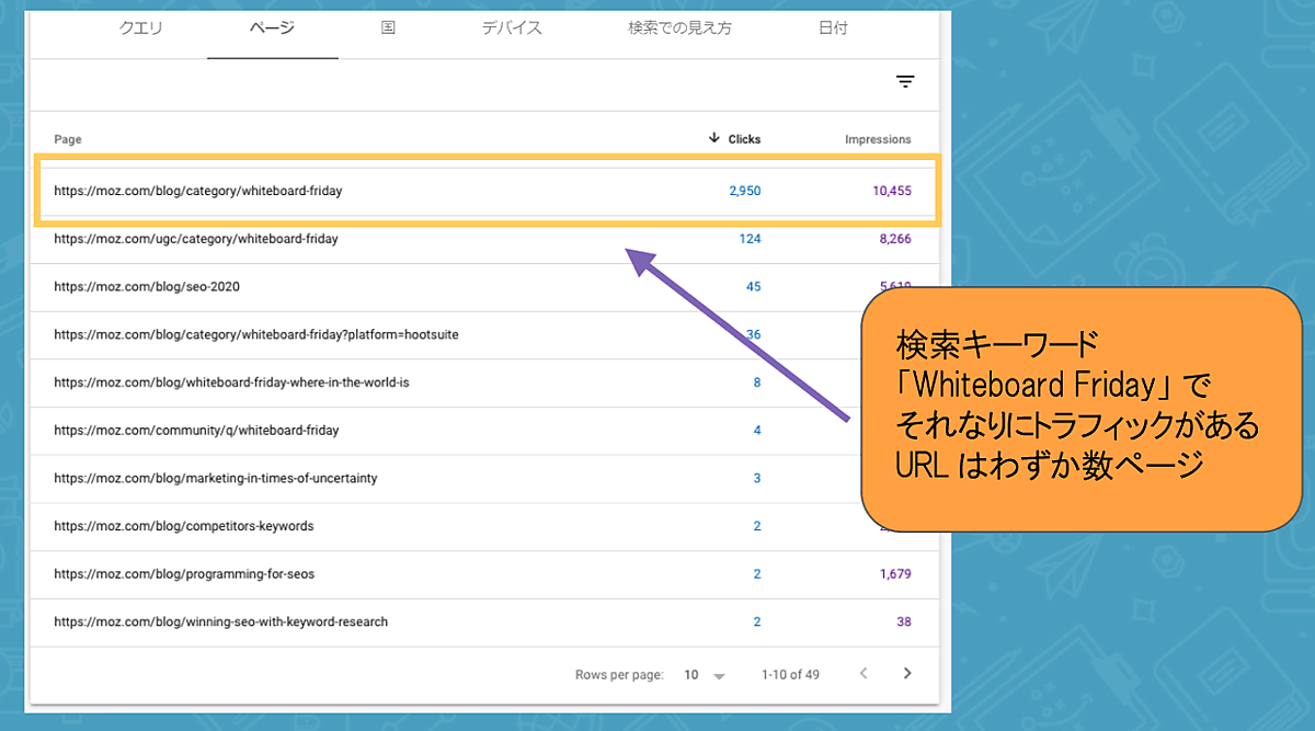 この場合、「Whiteboard Friday」という検索キーワードのトラフィックはほぼすべてが、わずか1~2ページに向かっている。