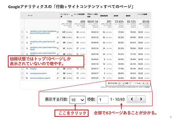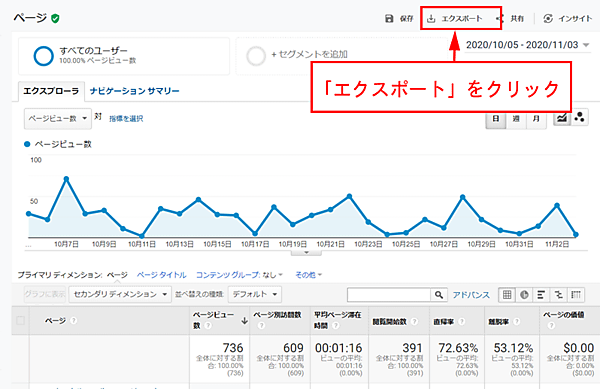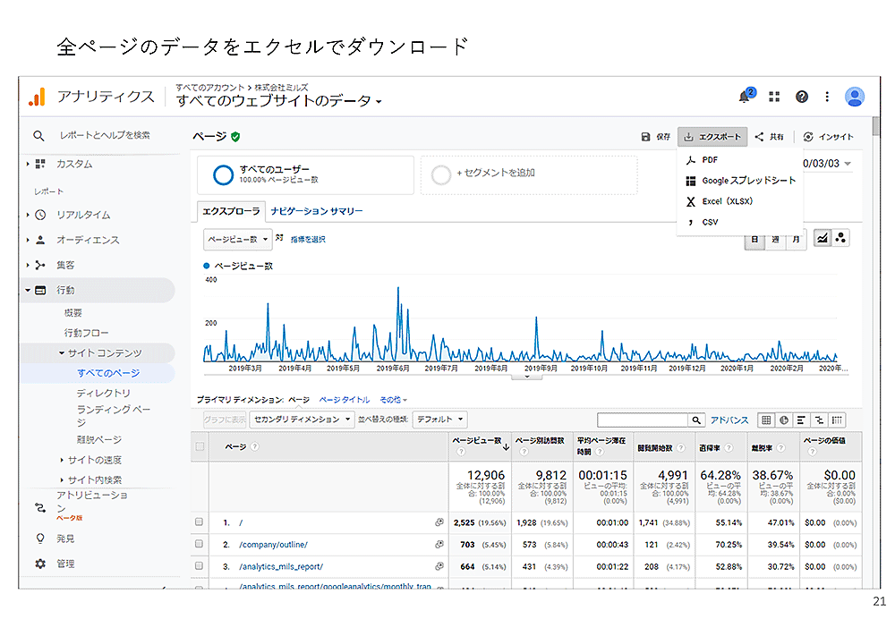 まず、Googleアナリティクスの「行動 > サイトコンテンツ > すべてのページ」を開き、全ページのデータをエクスポートします。