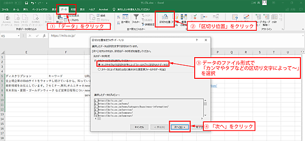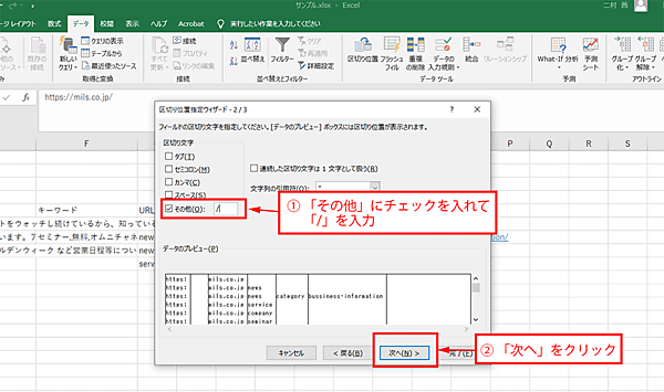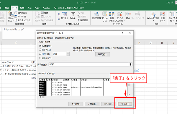 まず、今、URLが書かれているのはG列ですから、これを丸ごと選択してコピーし、一番後ろのJ列(キーワード)の右に丸ごとペーストしてください。G列がそのままK列になりました。つぎに、K列を選んで、Excelの「データ → 区切り位置」の機能を使い、「/」で分けましょう。きれいに階層ごとに列を分けてくれます。