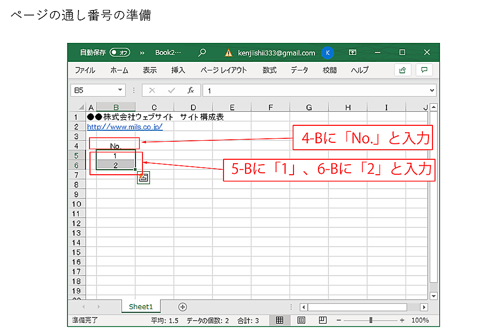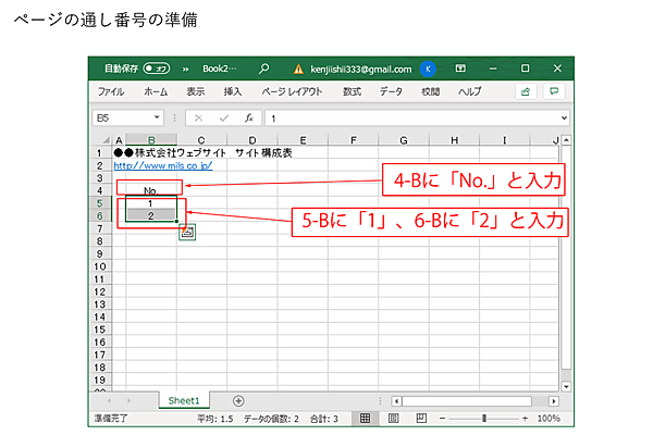 次に、ページに通し番号をつけます。4-Bセルに「No.」と見出しを書き、その下の5-Bに「1」、6-Bに「2」と入れてください。B列全体を選んでセンタリングすると見やすくなります。
