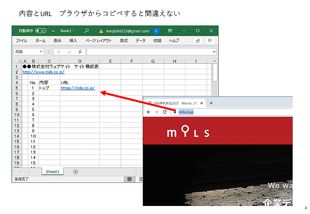 その下には、「トップ」「https://mils.co.jp/(自社サイトのトップページURL)※」と入れます。このURLは次の図のように、ブラウザで実際にページを開いてアドレス欄からコピーしましょう。