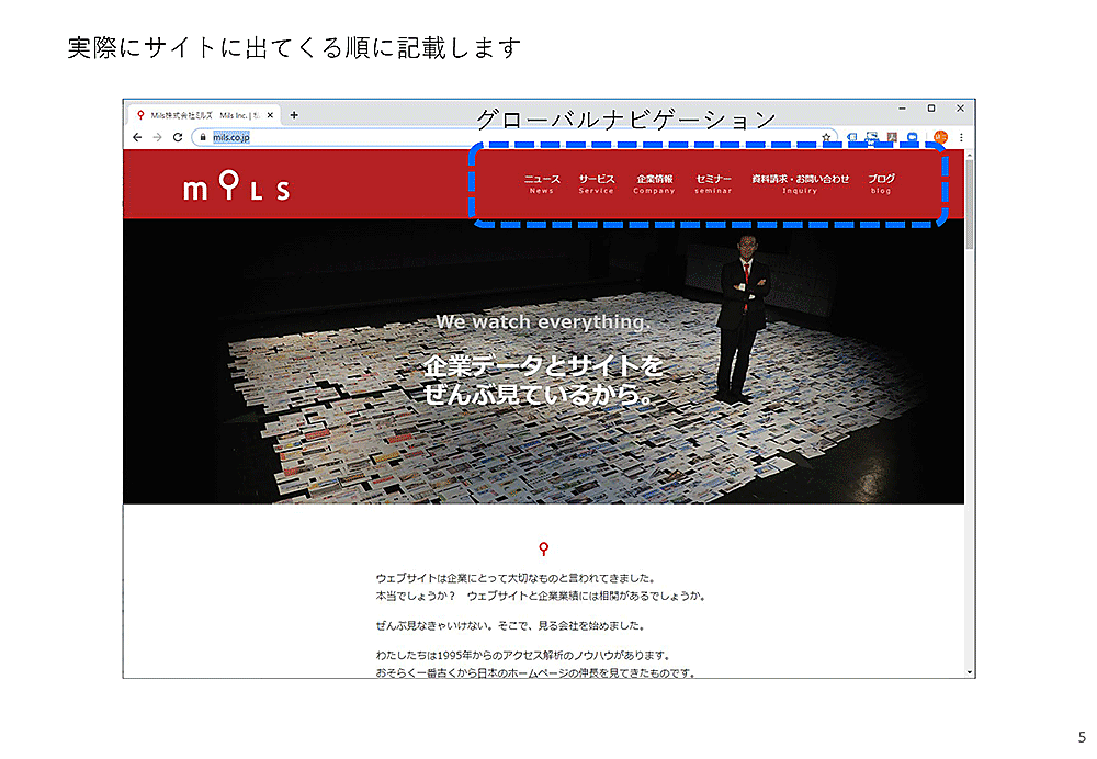 さて、ブラウザで改めてトップページを見てください。サンプルにしているサイトでは、下図のようにページの上部に「グローバルナビゲーション」があります。今のウェブではこのグローバルナビゲーションがほぼ全ページにあって、どこからでも重要ページに移動できます。このグローバルナビゲーションはサイト内のコーナー分けを示すもので、サイトを見に来た人はこれを見てサイトの全体構造をつかみます。