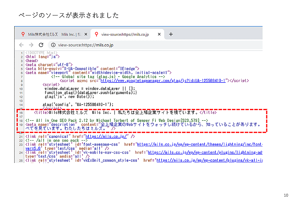すると、別タブでページのHTMLソースが表示されます。アルファベットだらけのところはいったん無視して、前の方に出てくる日本語を探してください。下図の赤で囲ったような部分です。探す場所はソースの先頭から数行のところにある<head>の中にある、<title>と</title>の間です。