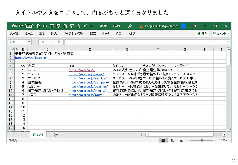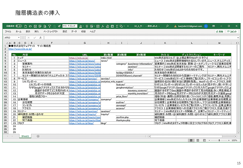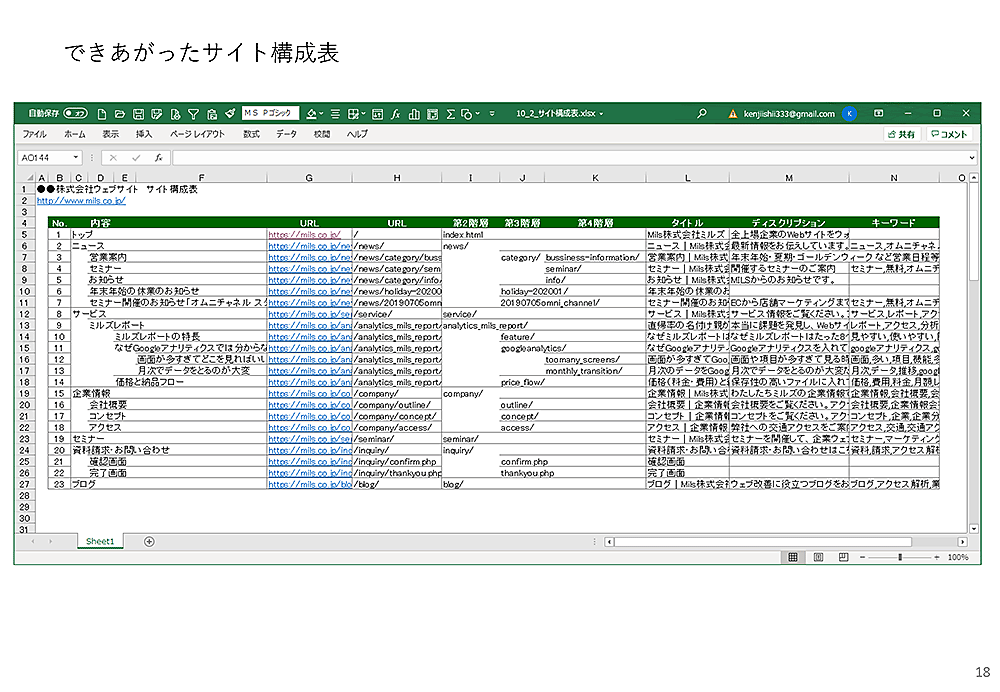 こうして作っていけば、少なくともページタイトルは入った形で、しかも成績表のついたサイト構成表がつくれます。あとは、メタの情報などを少しずつ入れていけば、十分実用に耐えるサイト構成表ができあがります。