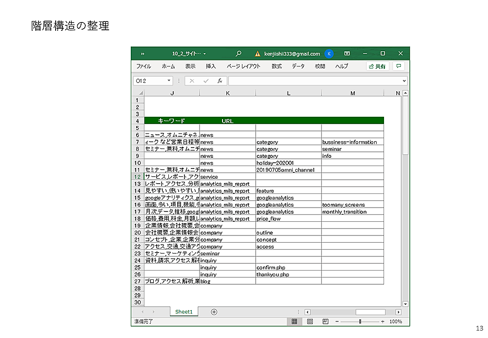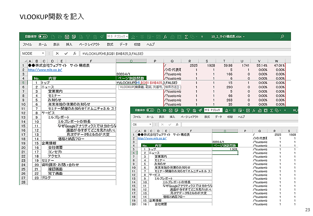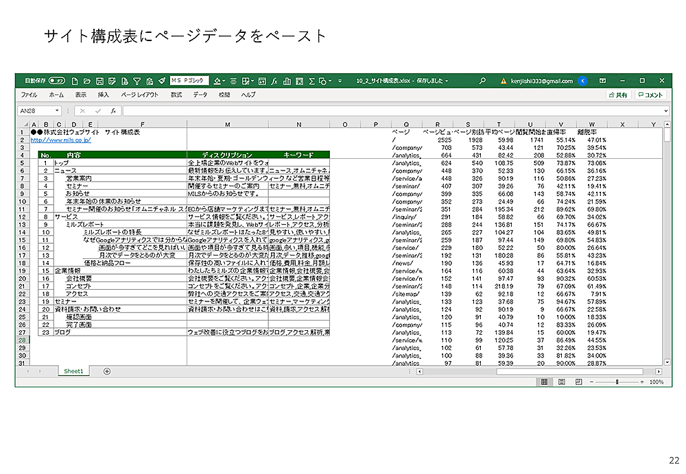 最後に、Googleアナリティクスから取ってきたデータと、Excelで作ったサイト構成表を合わせて、ページの成績表を作成してみましょう。